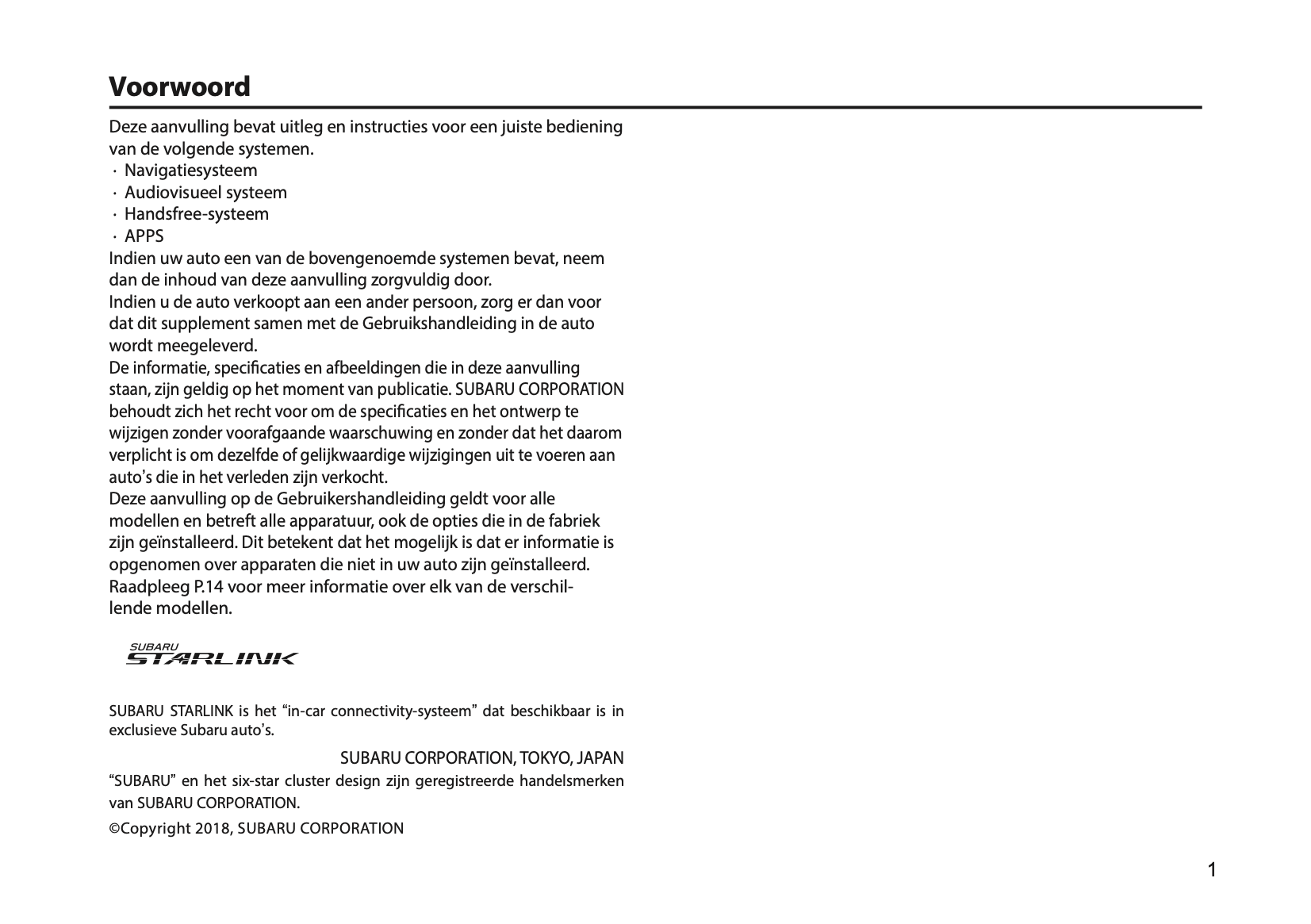 2019 Subaru XV Infotainment Supplement Manual | Dutch